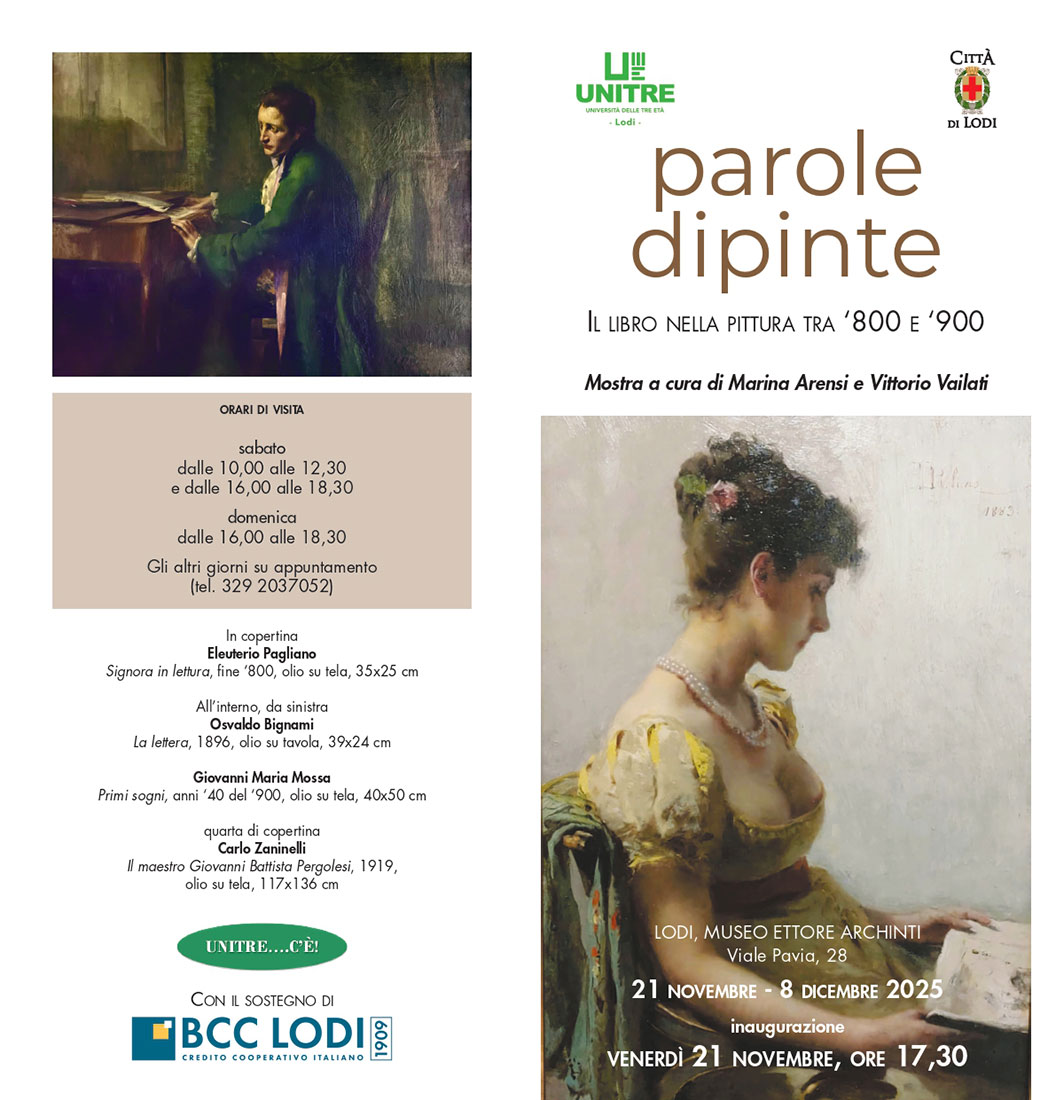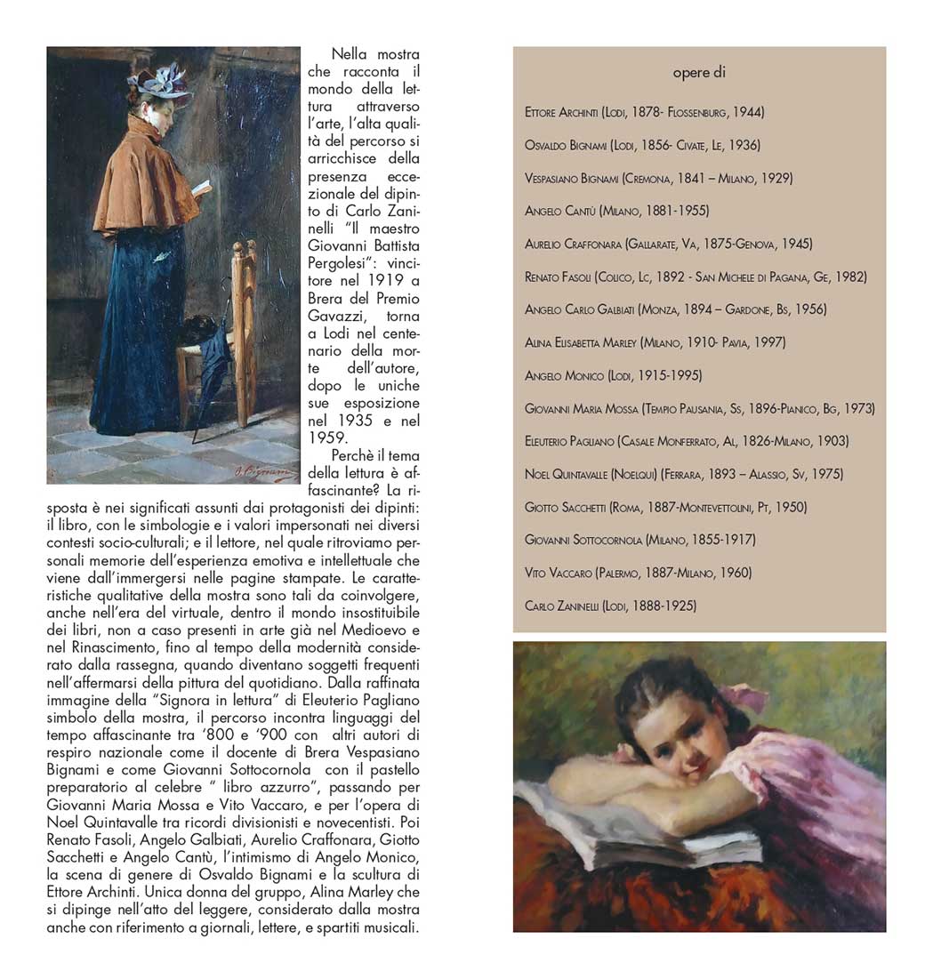 La mostra conduce nel mondo affascinante della lettura e del libro, soggetto dei quadri con il valore culturale di conoscenza, di simbolo e di progresso assunto attraverso i secoli. E parla di pittura, la bella pittura del tempo affascinante tra Ottocento e Novecento introdotta dallo splendido dipinto “La lettrice” di Eleuterio Pagliano, riassunta nei linguaggi di 16 autori, selezionati secondo un criterio di qualità tra le personalità di rilievo nel panorama italiano del periodo considerato. Ospite d’eccezione, nel centenario della morte dell’autore, è il grande dipinto del lodigiano Carlo Zaninelli “Il maestro Giovanni Battista Pergolesi”, che torna a Lodi dopo le uniche sue presenze espositive del 1935 e del 1959.